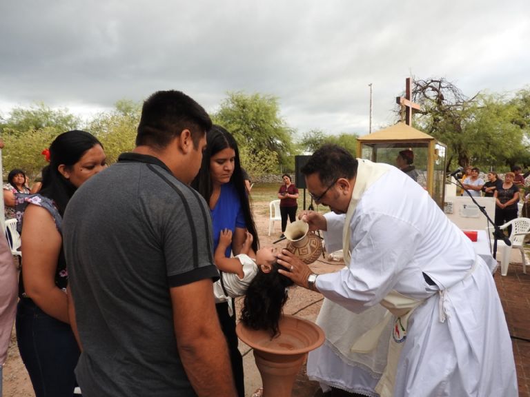 Posteriormente se administró el sacramento del Bautismo a dos pequeñas de la comunidad, cuyos padres y padrinos recibieron la Catequesis prebautismal a la sombra de los añosos algarrobos del lugar.