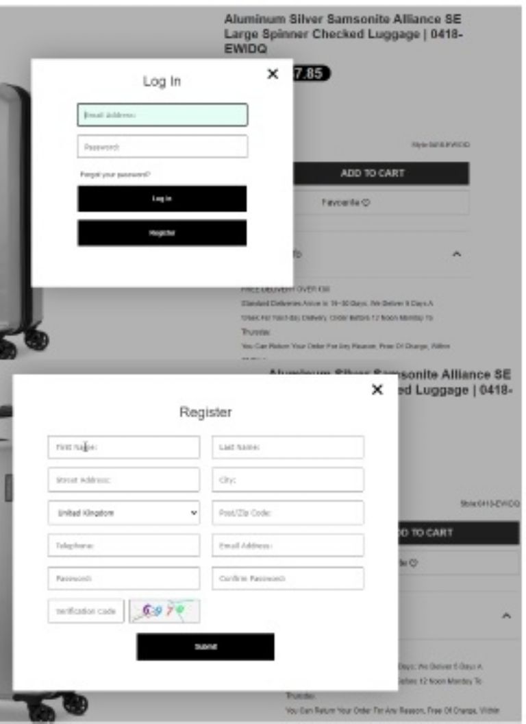 A medida que se navega por el sitio, aparecen más indicios de engaño. Cuando intenta añadir un artículo al carrito, aparece una ventana emergente de inicio de sesión que le obliga a iniciar sesión con las credenciales existentes o a registrar una nueva cuenta. Este paso es crucial para el estafador, ya que es el momento en el que, sin saberlo, envías información confidencial (incluidos nombres de usuario y contraseñas) directamente al atacante.
