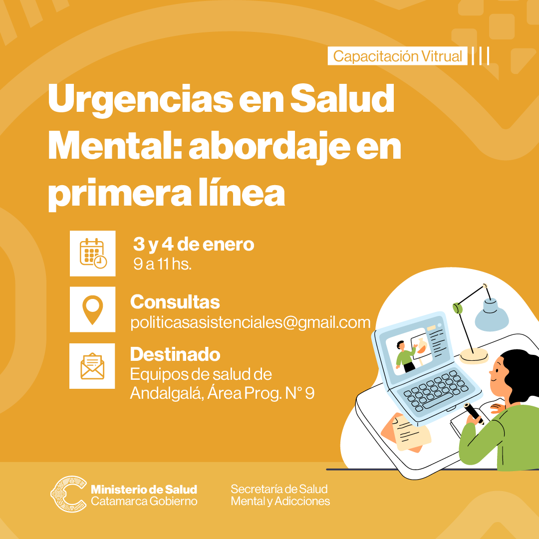 Con el objetivo de brindar herramientas para el abordaje en primera línea, la Secretaría de Salud Mental y Adicciones del Ministerio de Salud brindará una capacitación virtual sobre Urgencias en Salud Mental para los equipos de trabajo de Salud del Área Programática 9 de Andalgalá.