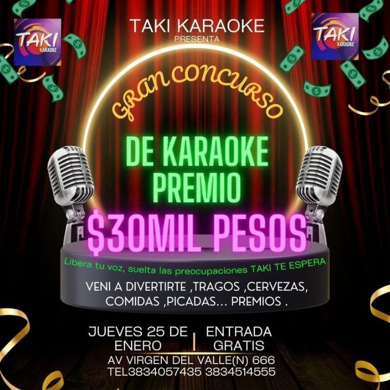 - Gran Concurso de Karaoke, con $ 30.000 de premio, a las 22 hs. En Taki Karaoke (Av. Virgen del Valle 666). Entrada gratuita.
