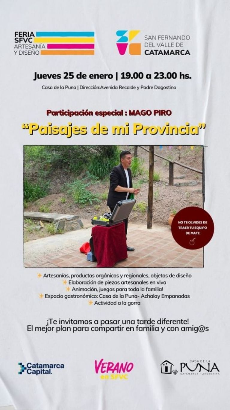 - "Paisaje de mi provincia" feria artesanal y de diseño, gastronomía, animación, juegos para toda la familia con la participación especial de Mago Piro, de 19 a 23 hs. en Casa de la Puna (Recalde y Padre Dagostino). Actividad a la gorra.