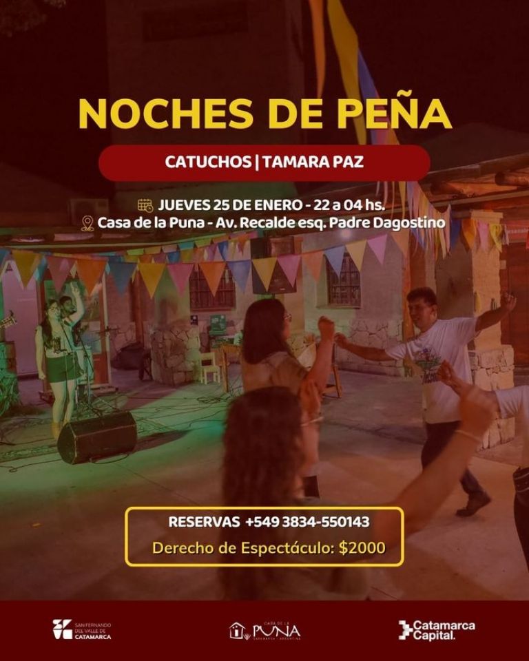 - Noches de Peña con la actuación de Catuchos y Tamara Paz, de 22 a 4 hs. en Casa de la Puna (Recalde y Padre Dagostino). Derecho de espectáculo $ 2000.