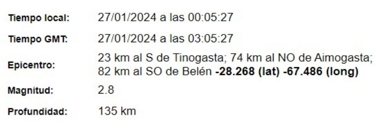 El Instituto Nacional de Prevención Sísmica (INPRESS) registró que el movimiento fue a las 00:05 de este sábado 27 de enero con una magnitud de 2,8 ° a 135 km. de profundidad