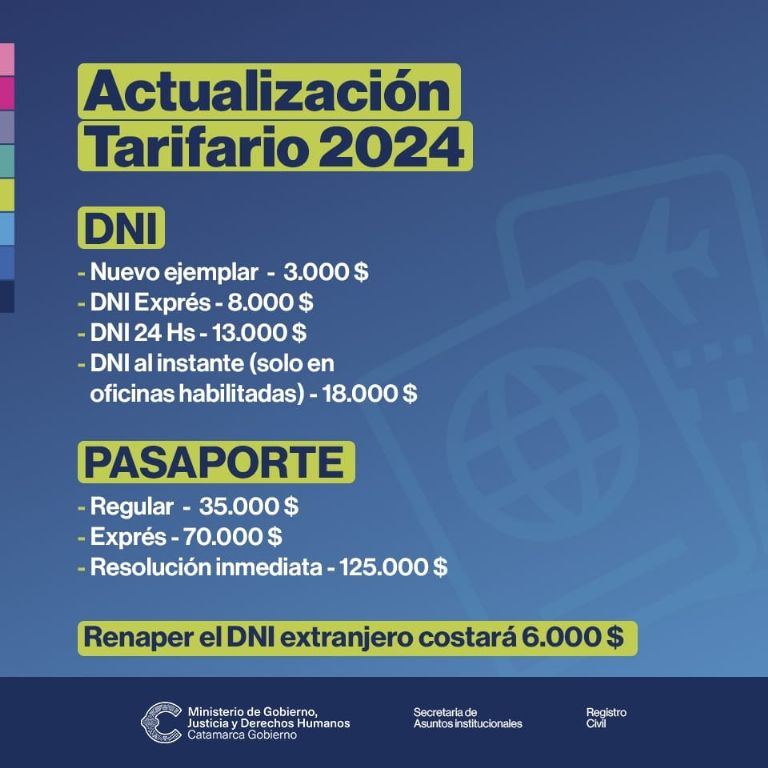 Según lo indicado oficialmente, el DNI regular tendrá un valor de $3.000 y el exprés costará $8.000; ambos con vencimiento a los 15 años de ser emitido. El Pasaporte regular pasará a costar $35.000 y el exprés $70.000. Los trámites de actualización de DNI a los 5/8 y 14 años costarán $3.000.
