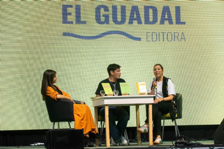 El Guadal Editora presentó cuatro obras que abarcan distintos géneros y estilos. Inaugurando su exposición, con dos poemarios de la saga Chinitas que reúne a poetas mujeres catamarqueñas, subieron al escenario Celia Sarquís, presentando “La tierna ferocidad de los días”, y Estefanía Herrera compartiendo “Diestra”.