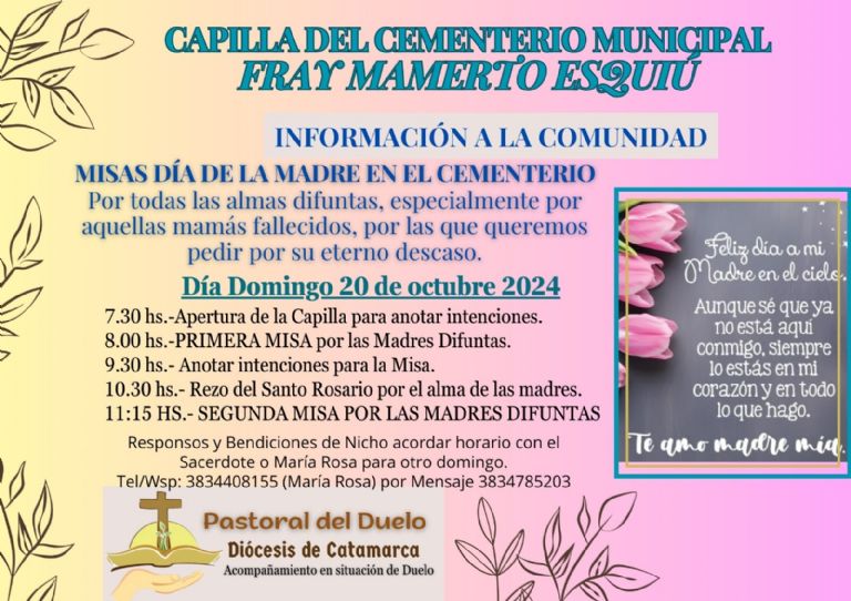 Por responsos y bendición de nichos se debe acordar horario con el sacerdote o María Rosa para otro domingo. Por whatsapp al 383 4408155, por mensaje al 383 4785203.