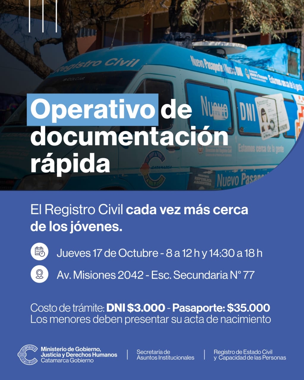Este jueves el Registro Civil Catamarca dará inicio al operativo denominado "Registro Civil siempre cerca" de los jóvenes en la Escuela 77, ubicada en Av. Misiones 2024, para brindar el servicio de documentación rápida a los alumnos, la comunidad escolar y vecinos de la zona sur de la ciudad.