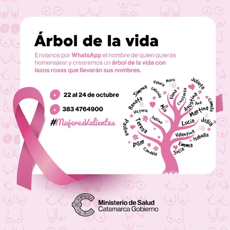 El día jueves 24 de octubre se construirá un “Árbol de la Vida” en el hall central del Ministerio. Se invita a todas las personas que quieran sumarse, a enviar un mensaje de WhatsApp con el nombre de una persona que quieran homenajear, del 22 al 24 de octubre al número 3834 76 4900. Con todos los nombres recibidos, la Dirección Provincial del Cáncer, adornará las ramas del árbol.
