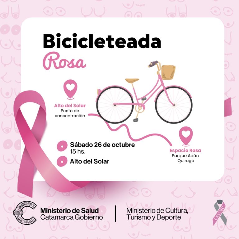 Cómo cierre del Mes Rosa, el sábado 26 de octubre se realizará la “Bicicleteada Rosa”, que iniciará a las 15 horas en Alto del Solar, hasta el Espacio Rosa ubicado en el Parque Adán Quiroga.