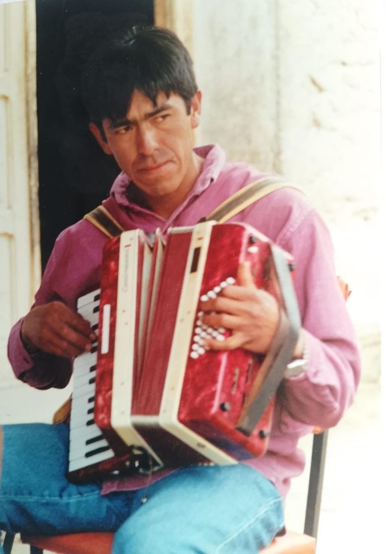 Había llevado su acordeón y casetes del Grupo Belicho, que escucharon personas que se acercaron al "Taller de Tejido", y se interesaron.
