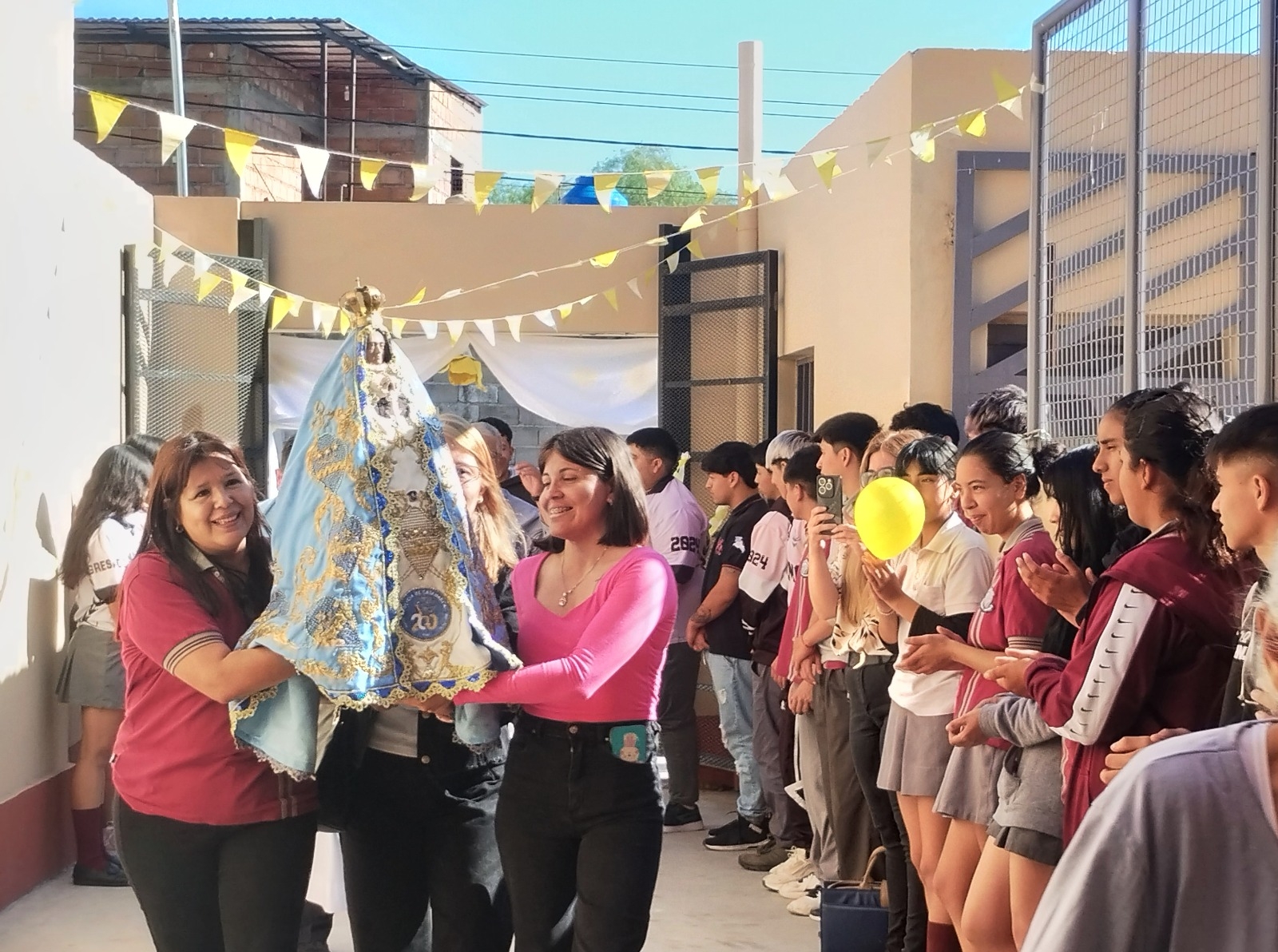 Durante la mañana de este viernes 25 de octubre, fue recibida con mucha alegría en la escuela secundaria N° 84 Madres de la Patria ubicada en la zona sur de la ciudad capital. El personal directivo, docente y alumnos de la institución escolar, junto con una delegación de alumnos de la escuela primaria N° 323 Juan Alfonso Carrizo, que funciona en el mismo predio escolar, y algunos vecinos del sector vivieron un momento especial con la llegada de la Ilustre Visitante.