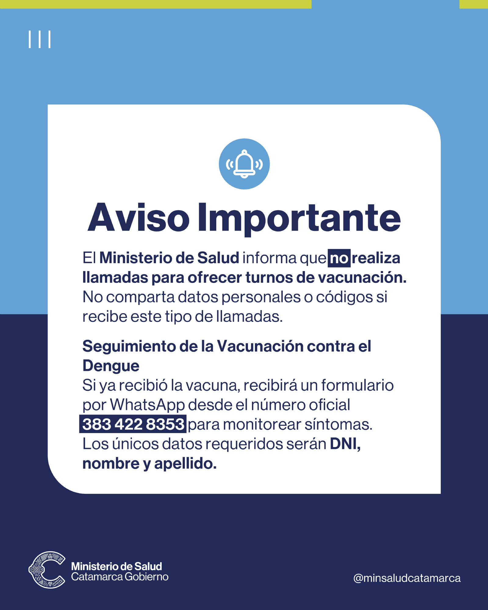 Aquellas personas que ya recibieron la vacuna contra el Dengue, recibirán un formulario a través de WhatsApp (383 422 8353), único medio oficial del Ministerio de Salud para este propósito, con el fin de monitorear los síntomas o posibles efectos secundarios que puedan experimentarse tras la inoculación.