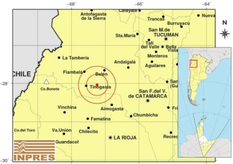Epicentro: 32 km al E de Tinogasta; 48 km al SO de Belén; 72 km al NO de Aimogasta -28.037 (lat) -67.242 (long)
