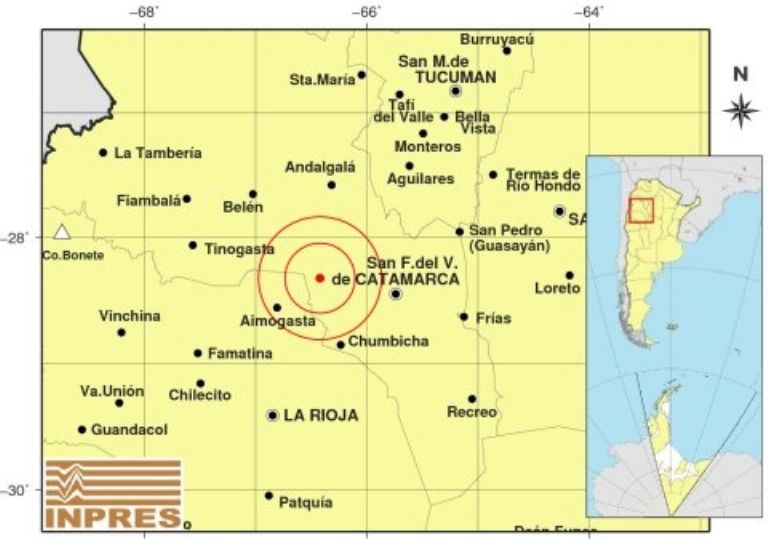 Epicentro: 46 km al NE de Aimogasta; 61 km al N de Chumbicha; 65 km al O de Catamarca -28.325 (lat) -66.421 (long)