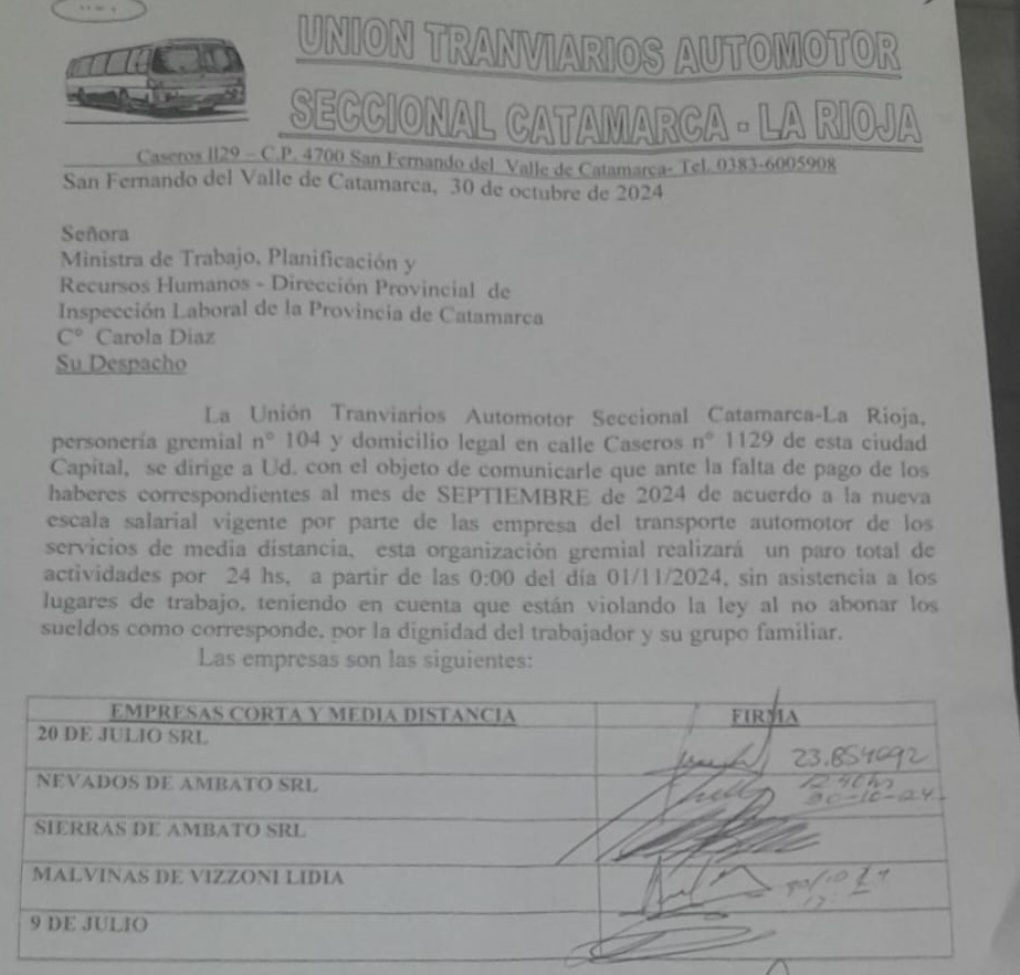Ante la falta de pago de los haberes correspondientes al mes de septiembre, a partir de la medianoche de este jueves, los servicios de transporte de corta y mediana distancia hacia El Rodeo, La Puerta, Nueva Coneta y Miraflores se verán afectados debido a un paro de 24 horas anunciado por el gremio UTA.