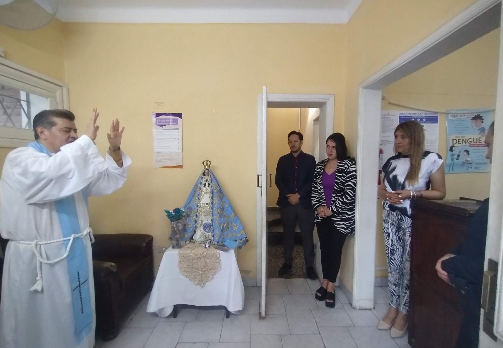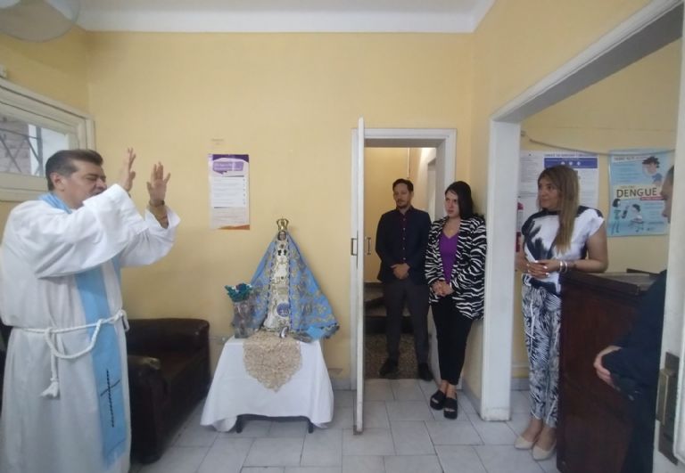 A su arribo a las instalaciones ubicadas en la intersección de calles Junín y Esquiú, fue recibida por quienes allí desempeñan sus tareas diariamente, y luego de que fue colocada en el altar preparado para Ella, rezaron el Ave María y el sacerdote les impartió la bendición.