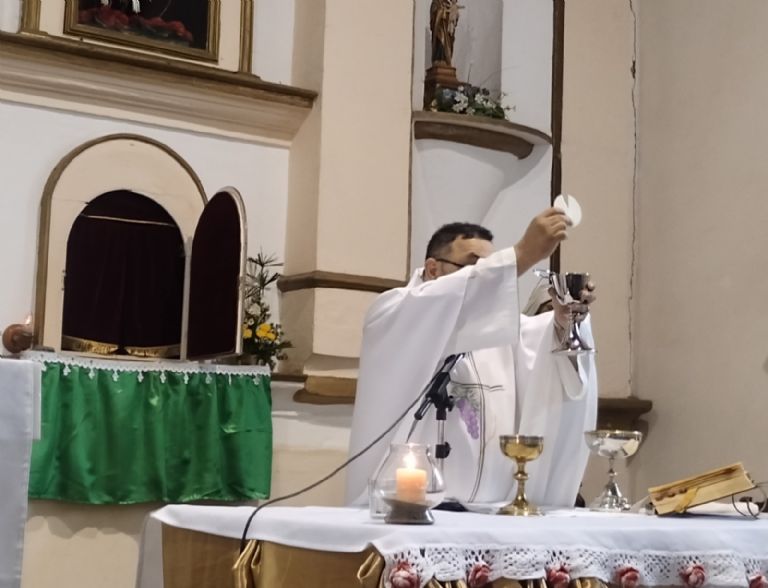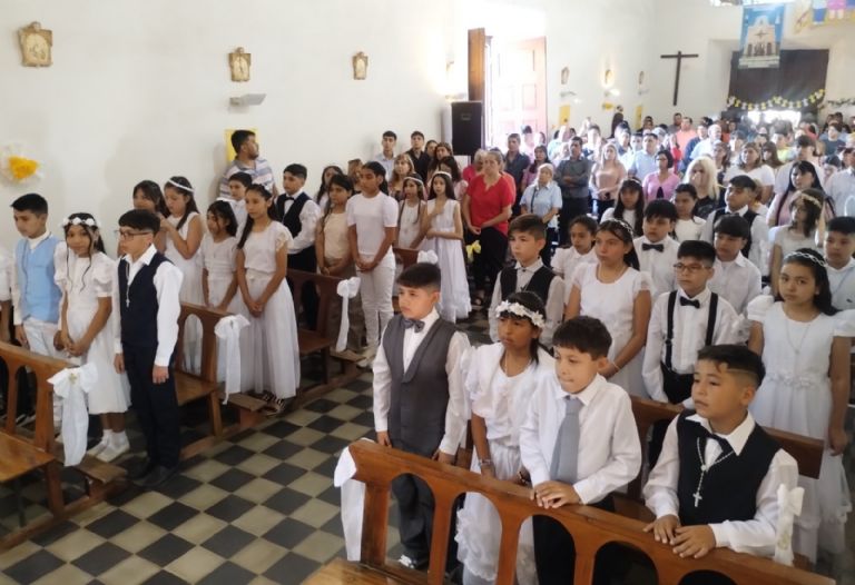 primera fue presidida por el párroco, padre Marcelo Amaya, quien en el inicio de su homilía comentó que “ahora recibirán a Jesús Eucaristía 33 chicos, y en la otra celebración -presidida más tarde por el padre Rogelio Suárez- tendremos los otros 30. Es una alegría para la Iglesia que sigan recibiendo el Sacramento de la Comunión, que es el Cuerpo y la Sangre del Señor, por la cual nos alimentamos espiritualmente”. Y enfatizó que “la Iglesia nace y vive de la Eucaristía”.