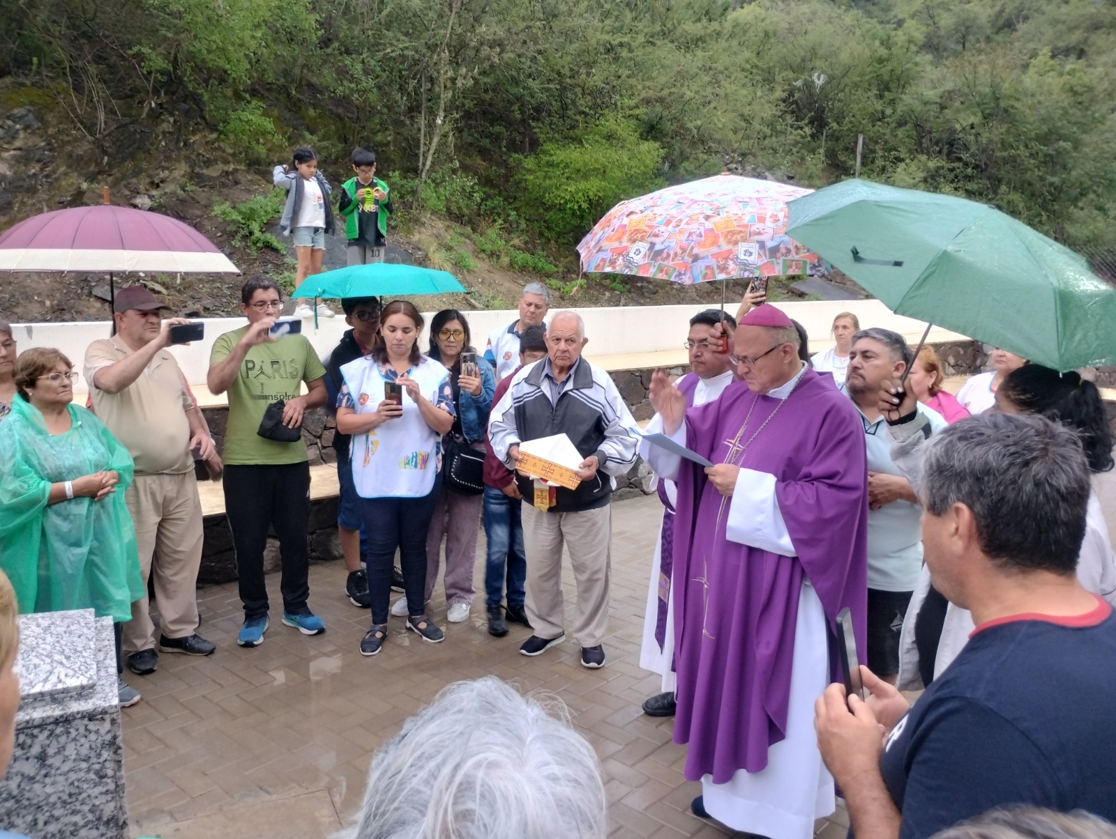 Luego de la celebración eucarística, el pastor diocesano invitó a los fieles presentes a dirigirse hasta el Patio de Cruz, donde procedió a la bendición del Cinerario, bajo la serena llovizna de la jornada.