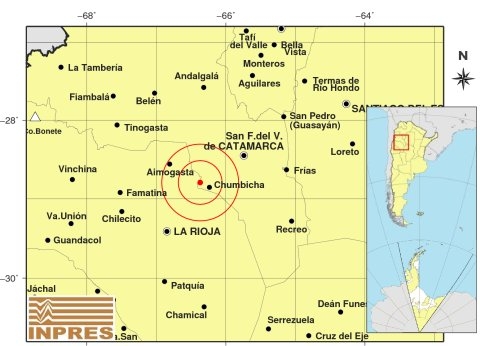 Epicentro: 14 km al NO de Chumbicha; 50 km al SE de Aimogasta; 68 km al SO de Catamarca -28.794 (lat) -66.368 (long)