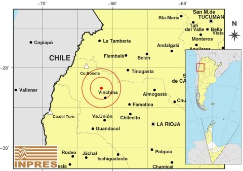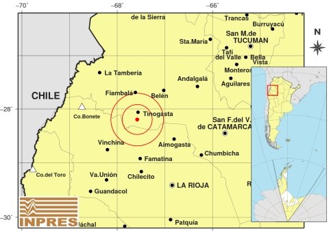 Epicentro: 14 km al S de Tinogasta; 81 km al SO de Belén; 86 km al NO de Aimogasta -28.196 (lat) -67.581 (long)