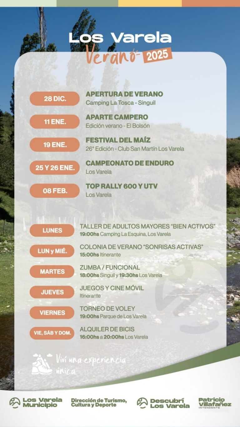 En cuanto a actividades recreativas, la Colonia de Verano "Sonrisas Activas" promete momentos divertidos para los más pequeños, mientras que el Taller de Adultos Mayores "Bien Activos" ofrecerá una propuesta ideal para que los más grandes se mantengan en forma. Además, la Zumba/Funcional en Singuil y Los Varela, el Torneo de Vóley en el Parque de Los Varela, y los Juegos y Cine Móvil itinerante serán las opciones perfectas para disfrutar de la actividad física y el entretenimiento en grupo.