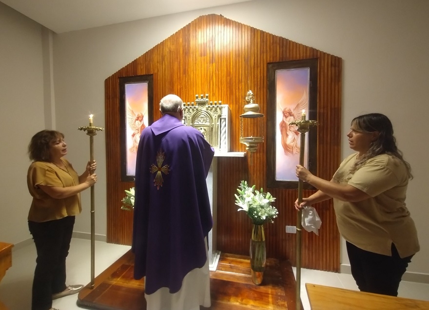 Después de la Comunión, el Obispo realizó la oración de bendición y roció con agua bendita la Capilla, luego de lo cual llevó en procesión a Jesús Sacramentado por el interior del templo hasta el nuevo lugar acondicionado y bendecido, donde quedó reservado para la adoración de los fieles.