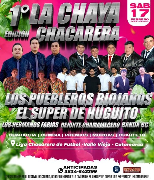 Con la organización y producción del Patio Cervecero Chacarero “AquÍ me quedo yo” y la Liga Chacarera de Fútbol, fue anunciada la “1ra. Chaya Chacarera”, evento artístico/musical, que tendrá las actuaciones de los Hermanos Farías, Rejunte Chamamecero, La Banda BC, el Súper de Huguito, Los Pueblerinos Riojanos, y varios artistas más.
