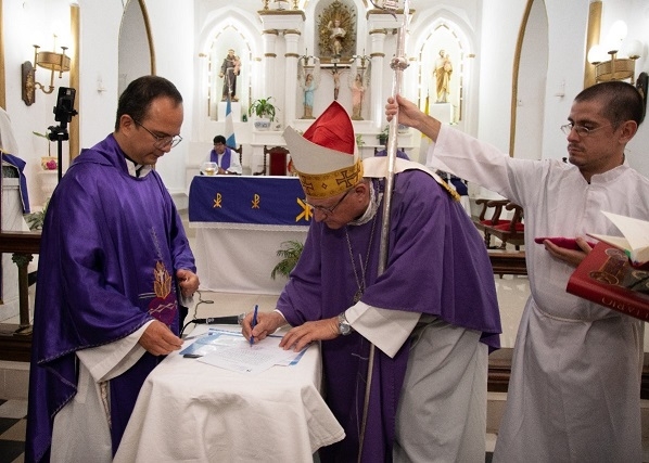La ceremonia de asunción del nuevo oficio se concretó durante la Santa Misa presidida por el obispo diocesano, Mons. Luis Urbanc, y concelebrada por el párroco saliente, P. Humberto Carrizo; los párrocos de Nuestra Señora de la Candelaria (Pomán), P. Sergio Chumbita, y de Nuestra Señora del Rosario (Paclín), P. Martín Brizuela; y el vicario parroquial de Nuestra Señora de Fátima, P. Javier Cisternas.