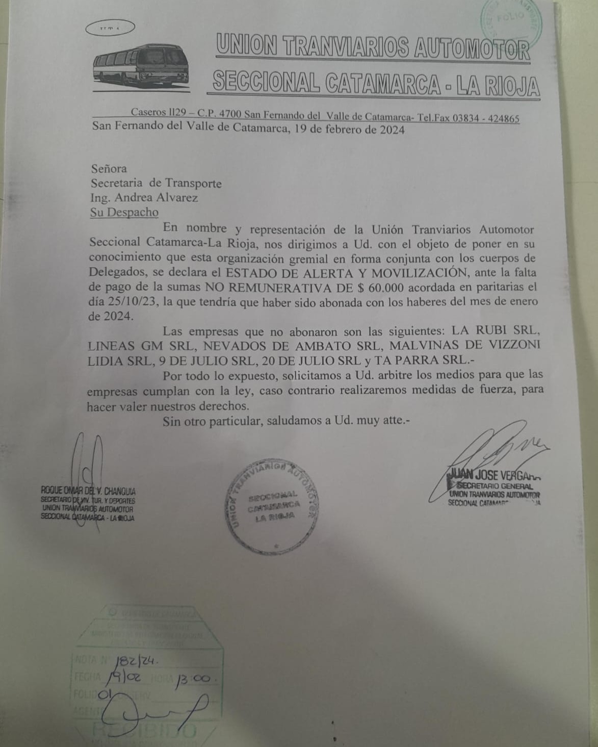 La misiva sindical lleva las firmas de Juan José Vergara y Roque Omar del Valle Chanquía, secretario general y de Vivienda, Turismo y Deportes, respectivamente, de la UTA Catamarca/La Rioja.