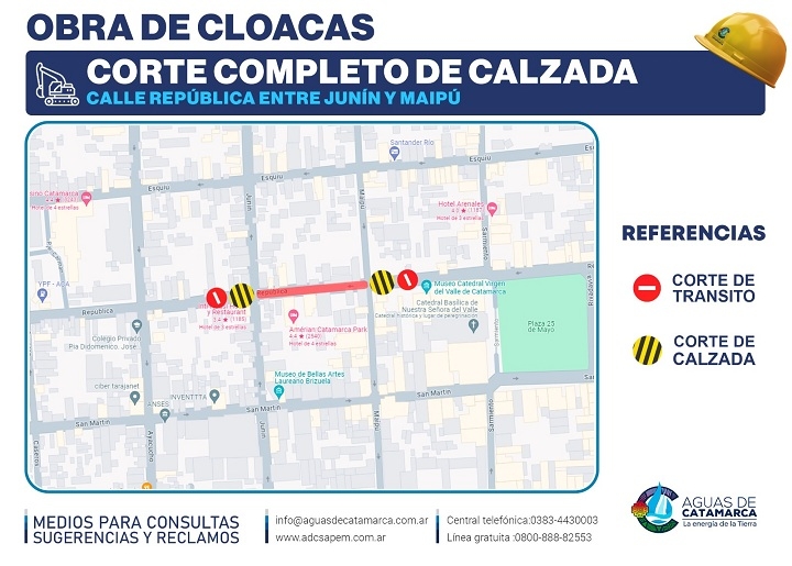 Aguas de Catamarca informó que trabaja en el mantenimiento del sistema de saneamiento en calle República entre Junín y Maipú.