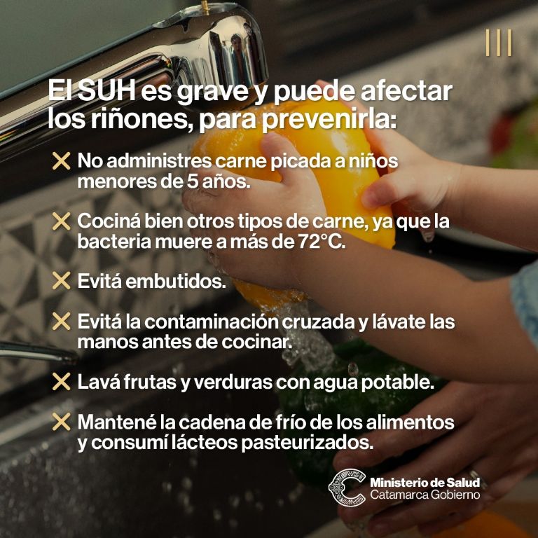 El SUH “es producido por la bacteria Escherichia coli a través de una toxina producida por la bacteria responsable de toda la sintomatología”, explicó la licenciada en Nutrición, Priscila Carosella. Esta bacteria está presente en alimentos contaminados, principalmente en carnes crudas, carne picada y alimentos preparados con ellas como hamburguesas, albóndigas, chacinados, etc. “Por esta razón está prohibida la ingesta de alimentos preparados con carne picada en niños menores de cinco años”, continuó Carosella. Esta bacteria también puede estar presente en frutas, como por ejemplo la frutilla, y verduras, sobre todo las de hojas, y que muchas veces se consumen crudas; en el agua contaminada; en lácteos no pasteurizados y de persona a persona por el contacto con manos contaminadas. Sobre las medidas preventivas, la más importante es el lavado de manos con abundante agua y jabón previo a cualquier práctica, especialmente antes de cocinar. Además, la Nutricionista, recalcó la importancia de “cocinar completamente las carnes a una temperatura mayor a 72 grados. Lavado de manos antes y después de preparar los alimentos, y uso de utensilios específicos para la preparación de carne y para la preparación de otros alimentos con otros utensilios. Asimismo, Priscila Carosella hizo hincapié en que los menores de 5 años NO deben consumir carnes picadas o molidas, ni siquiera las picadas en el hogar; tampoco consumir lácteos y jugos no pasteurizados.