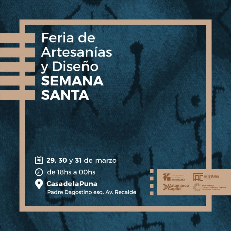 Catamarca se prepara para vivir del 29 al 31 de marzo una gran Feria de Artesanías y Diseño de Semana Santa, como parte de las actividades que realizará el Ministerio de Cultura, Turismo y Deporte junto a la Secretaría de Turismo y Desarrollo Económico de Catamarca Capital, en este fin de semana extra largo para ofrecer opciones de esparcimiento cultural para catamarqueños y turistas y buscando habilitar canales de comercialización para los hacedores culturales.