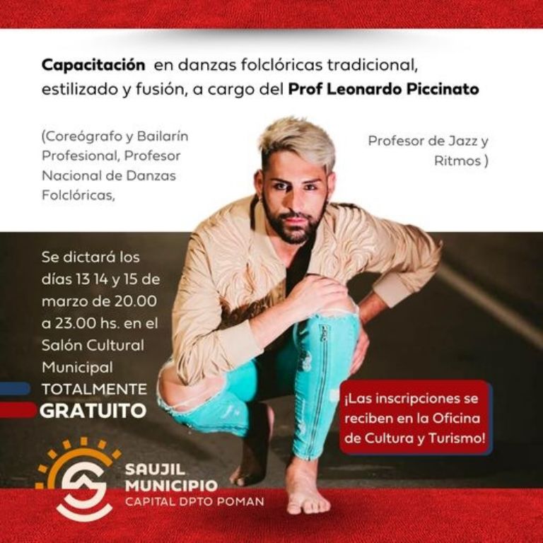 La capacitación se desarrollará los días 13, 14 y 15 de marzo en el salón cultural de la municipalidad de Saujil en el horario de 20:00 a 23:00 horas, la actividad es libre y gratuita, las inscripciones se receptan en las oficinas de la Dirección de Cultura y Turismo a cargo de Joaquín Moreno que al respecto comentó “la idea es capacitar a los chicos de nuestros talleres, nosotros tenemos talleres de danzas folclóricas en todos los pueblos de nuestra jurisdicción y de paso abrir la convocatoria para dar la posibilidad a los chicos de los IES que tienen la carrera de danzas como a la gente que le gusta bailar, si es integrante de un ballet o simplemente lo hace por diversión” acotando que con esta capacitación se brinda una importante herramientas para los asistentes a la capacitación “traerla era un objetivo de la municipalidad que teníamos hace mucho y como esta van a ser varias” anticipó Joaquín Moreno.