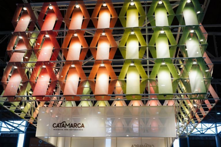 En tanto, la señalética del stand institucional de la Secretaría de Gestión Turística en el Pabellón de Turismo, conformada con bastidores metálicos e hilos de diversas gamas de colores que representan la marca "Hermosa por Naturaleza", evoca las tramas y tejidos catamarqueños, conjugando la riqueza natural y cultural de la provincia en un espacio diseñado para brindar una experiencia interactiva a los visitantes sobre los destinos turísticos.