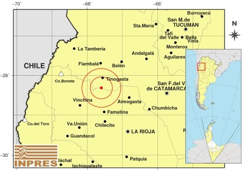 Epicentro: 27 km al S de Tinogasta; 77 km al NE de Vinchina; 82 km al O de Aimogasta -28.315 (lat) -67.599 (long)
