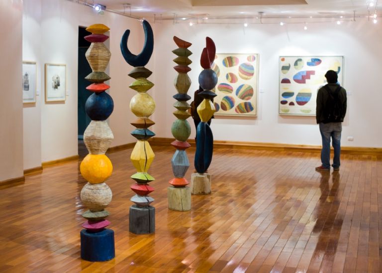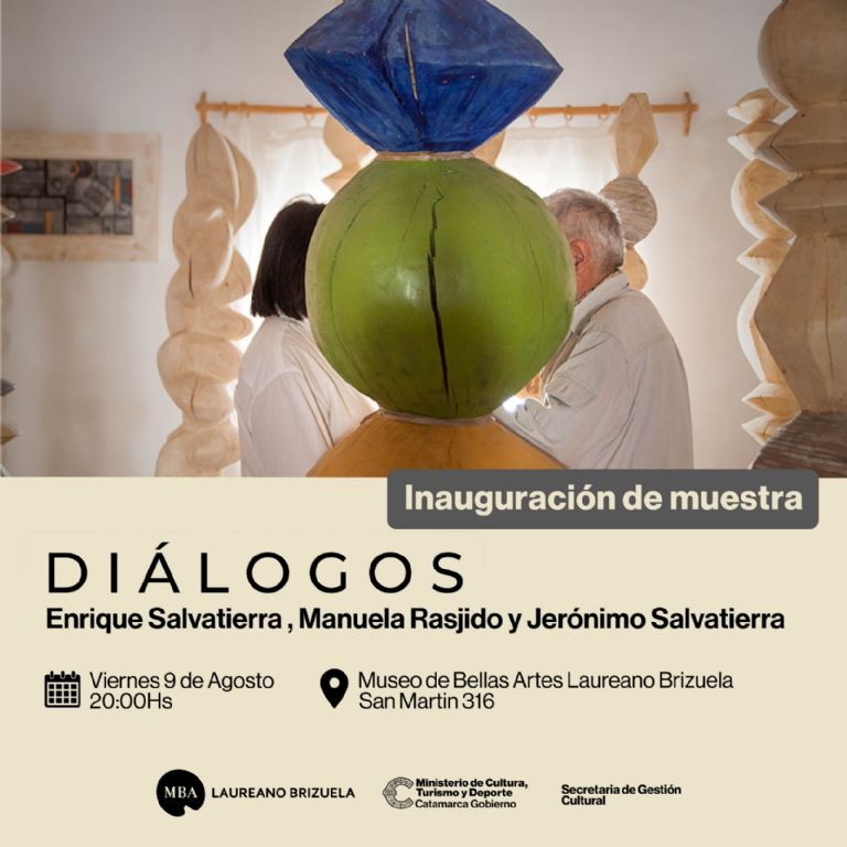 La muestra, denominada “Diálogos” es una simbiosis del pintor, escultor, ceramista y artista textil, Enrique Salvatierra, su esposa Manuela Rasjido, diseñadora textil y artista plástica. y el hijo de ambos, Jerónimo Salvatierra, de profesión arquitecto, y también artista plástico.