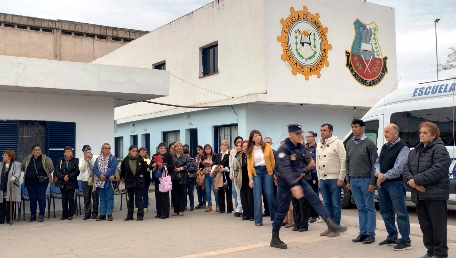 Todos juntos participaron del arriamiento de la Bandera nacional en el mástil ubicado en el patio junto a la urna con la imagen de la Virgen del Valle, Generala de la Policía de Catamarca.