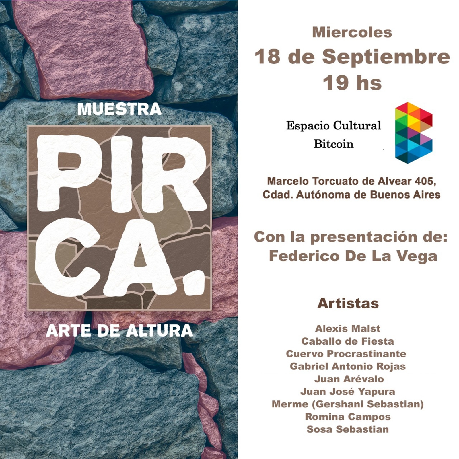 La muestra se denomina "PIRCA" y su inauguración se realizará el día miércoles 18 de septiembre con la curaduría del prestigioso artista Ricardo Celma y la presentación del músico cantautor catamarqueño Federico De La Vega en el Espacio Cultural Bitcoin en la Ciudad Autónoma de Buenos Aires (C.A.B.A.) y permanecerá abierta hasta finales del mes de noviembre. La propuesta es coordinada por los artistas locales Juan Arévalo y Juan José Yapura y con “Merme” a cargo diseño gráfico y redes.