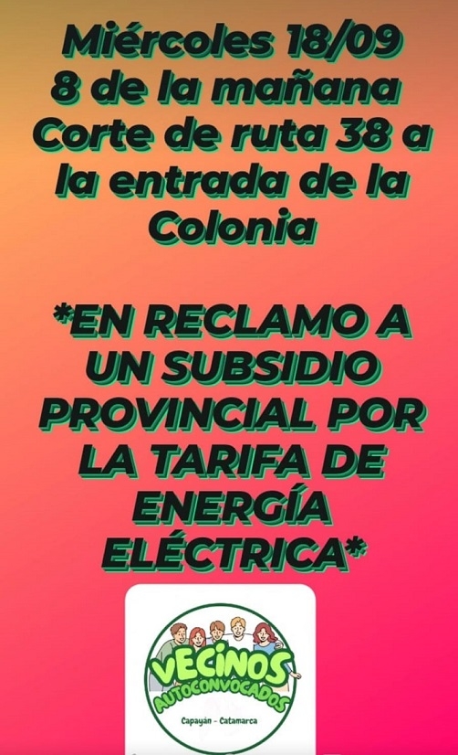 Vecinos Autoconvocados del departamento Capayán anunciaron un corte de la Ruta Nacional N°38 a partir de las 8 horas del miércoles, en reclamo del otorgamiento por parte del Gobierno Provincial de un subsidio al servicio de energía eléctrica.