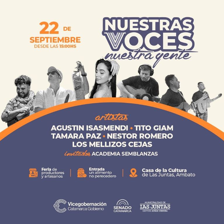 Este domingo 22 de septiembre en la Casa de la Cultura de las Juntas, Ambato, se llevará adelante desde las 15 horas la primera edición del festival "Nuestras Voces, Nuestra Gente", un evento organizado por la Vicegobernación que conduce Rubén Dusso junto a la Municipalidad de Las Juntas, conducida por Jorge Herrera, y que reunirá a diversos grupos de artistas que han participado en el ciclo "Nuestras Voces".