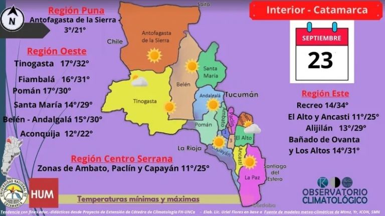 Desde el domingo 21 de septiembre ya se pudo sentir el intenso calor en la capital catamarqueña y en todo el país. La importante suba en las temperaturas trae una máxima de 33 grados para la jornada de este lunes 23 de septiembre en Catamarca.