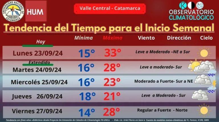El tercer día de primavera llega con un ambiente cálido y con temperaturas máximas previstas entre 30 y 35 grados. A pesar de una jornada calurosa para este lunes, la temperatura bajará durante el resto de la semana con probabilidades de lluvias para el día martes y miércoles, según el pronóstico del tiempo realizado por los integrantes del Observatorio Climatológico de la Universidad Nacional de Catamarca.