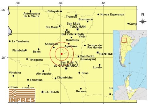 Epicentro: 37 km al O de La Cocha; 47 km al SE de Andalgalá; 71 km al N de Catamarca -27.851 (lat) -65.946 (long)