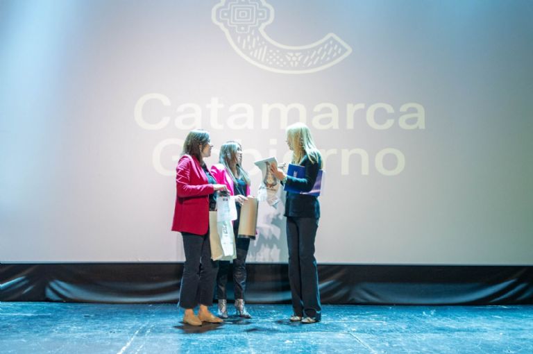Roldán, acompañada de la secretaria de Gestión Cultural, Laura Maubecín, hizo entrega de un tapiz con la imagen de la Virgen del Valle a Bettina Bulgheroni, productora de B&B Producciones y presidenta de la Fundación Educando.