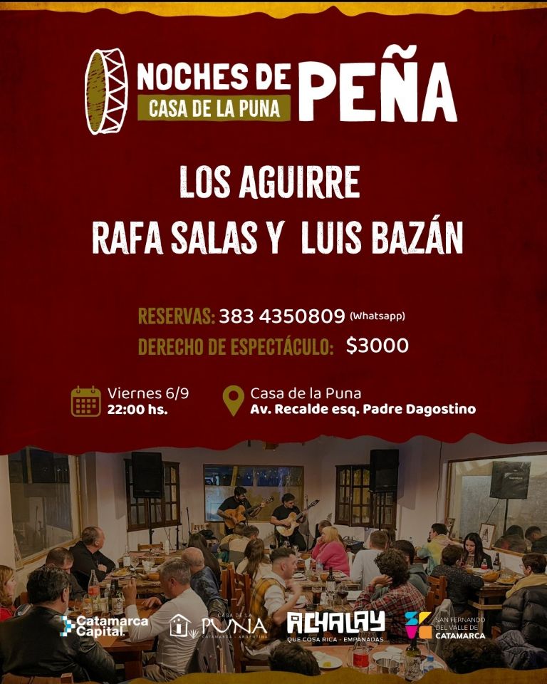 Recordamos también que esta noche habrá Peña en la Casa de la Puna desde las 22 horas con la actuación de Los Aguirre junto a Rafa Salas y Luis Bazán. El derecho de espectáculo es de $ 3.000 con reservas al +54 9 383 4350809.