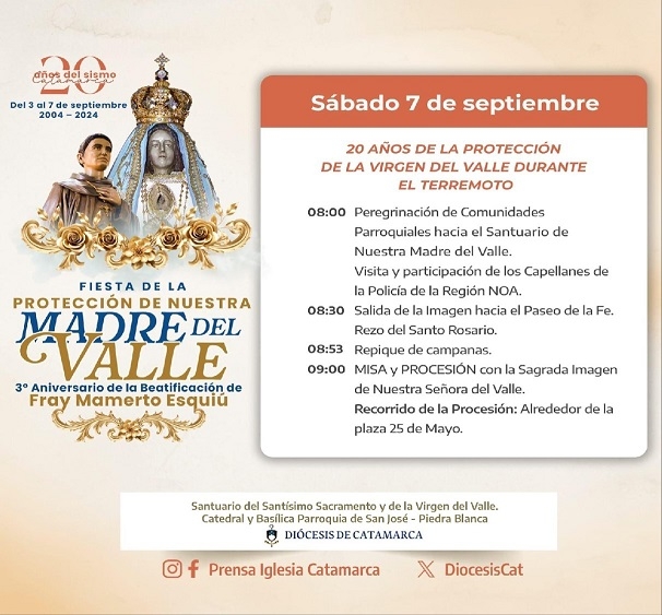 Se informa a la comunidad en general que el día de mañana, a horas 09:00, se llevará a cabo una misa en conmemoración de los “20 años de la Protección de la Virgen durante el terremoto del 2.004”. La misma tendrá lugar en la Catedral Basílica y luego se iniciará una procesión con la Sagrada Imagen alrededor de la Plaza 25 de Mayo.