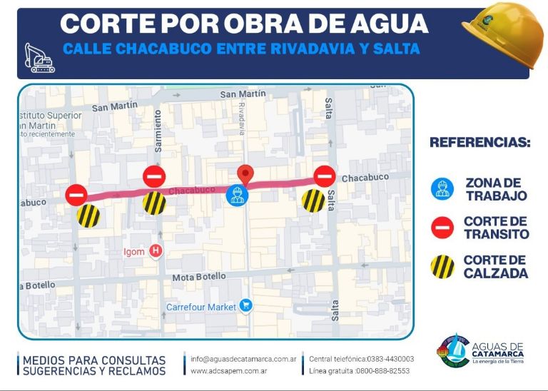 Con el objetivo de mejorar el servicio de agua en la zona, se llevará a cabo una obra que afectará el paso de vehículos en calle Chacabuco, entre Maipú y Rivadavia, desde las 14:00 horas hasta la noche.