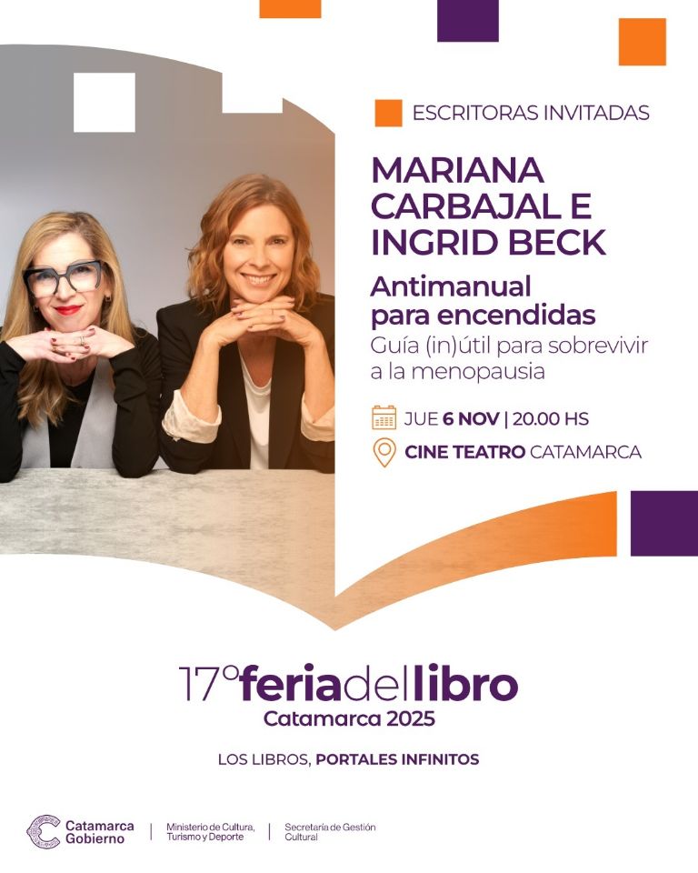En el marco de la 17° Feria del Libro de Catamarca, las periodistas y escritoras Mariana Carbajal e Ingrid Beck presentarán su nuevo libro “Antimanual para encendidas. Una guía (in)útil para sobrevivir a la menopausia” (Grijalbo, Penguin Random House). El encuentro se realizará el jueves 6 de noviembre a las 20 horas, en el Cine Teatro Catamarca.