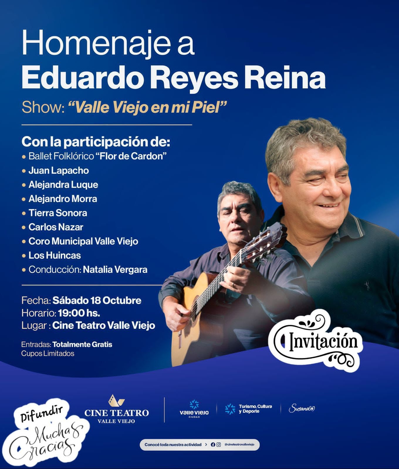 Este sábado 18 de octubre, a las 19 horas, el Cine Teatro Valle Viejo abrirá sus puertas para vivir una velada cargada de emoción y orgullo chacarero: el homenaje a Eduardo Reyes Reina, uno de los grandes referentes de la música popular del Valle, con el espectáculo “Valle Viejo en mi Piel”.