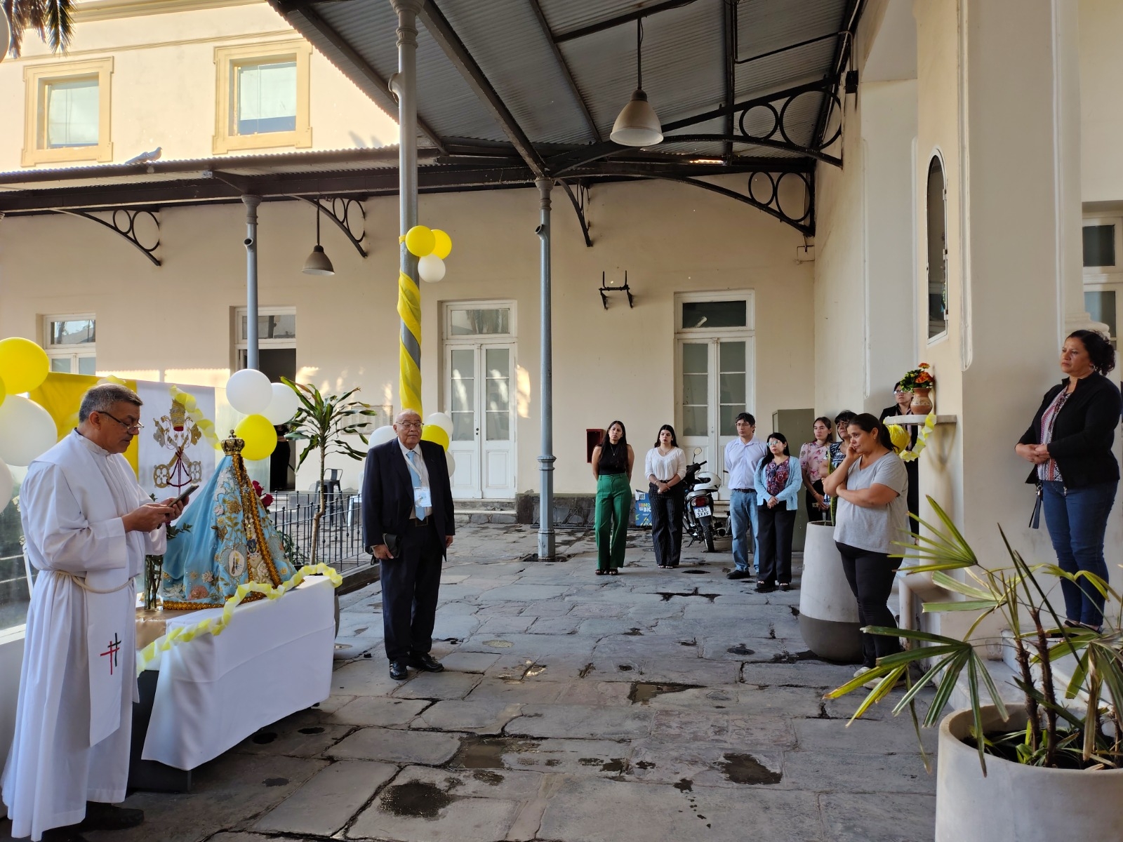 Finalmente, la Virgen fue colocada en un altar decorado con el escudo de la Santa Sede, globos y gallardetes amarillos y blancos, y todos los presentes recibieron la bendición tras el rezo del Padrenuestro y el Avemaría.